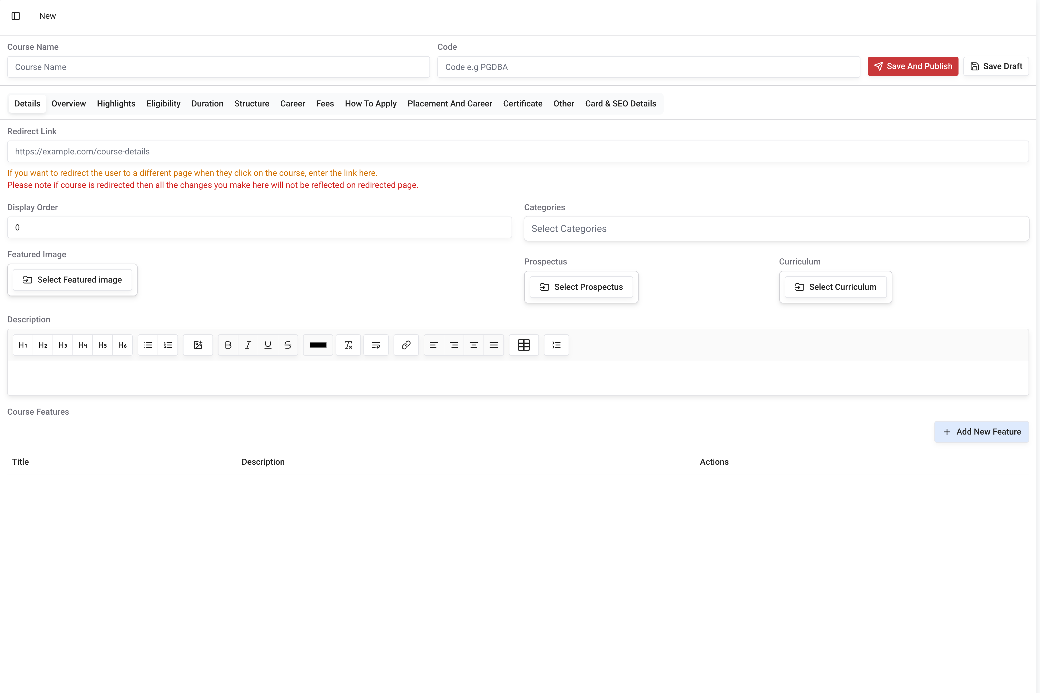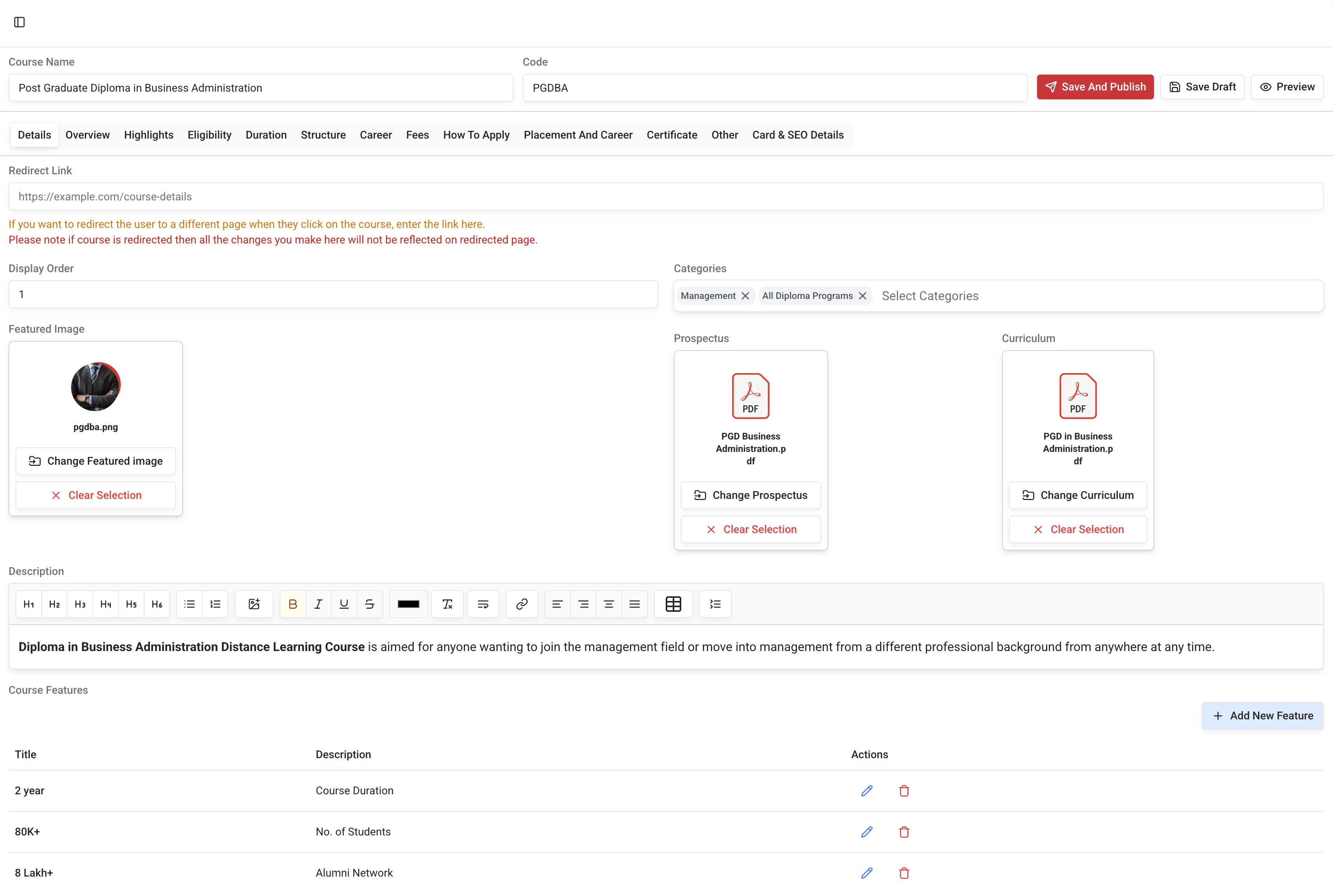 In the program details section, you can add the program details such as redirect link, display order, categories, featured image, descriptions and features.