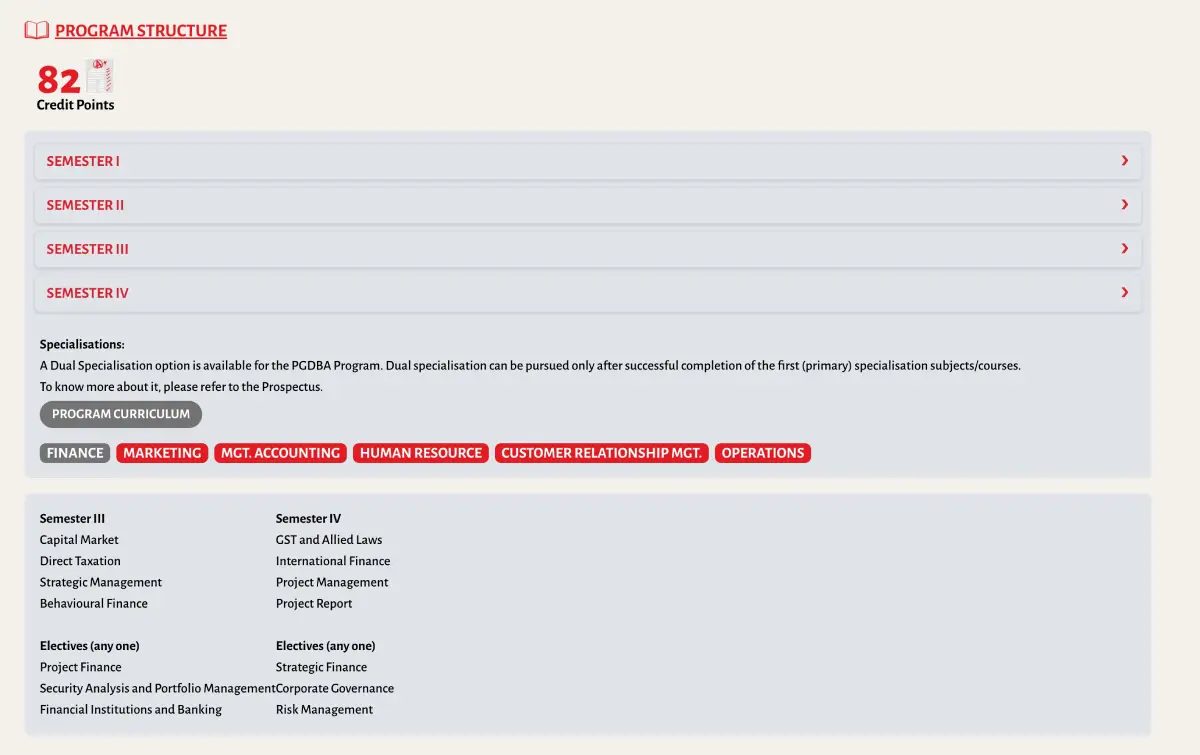 In the Program Structure section, you can add or edit credit points, content, icon, Semester Content and Specializations section.